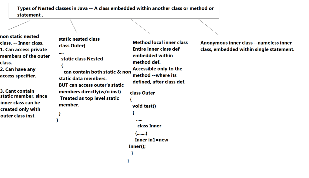 - The inner class(non-static nested) has access to all of the outer class’s members, including those marked private , directly(without inst.)