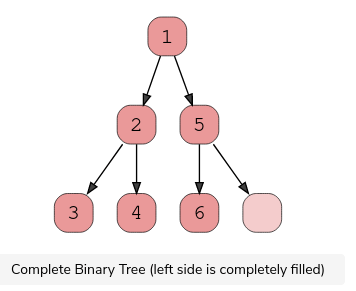 A complete binary tree exists when every level, excluding the last, is filled and all nodes at the last level are as far left as they can be. Here is a visual representation of a complete binary tree.