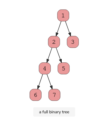 A full binary tree (sometimes called proper binary tree) exits when every node, excluding the leaves, has two children. Every level must be filled, and the nodes are as far left as possible. Look at this diagram to understand how a full binary tree looks.